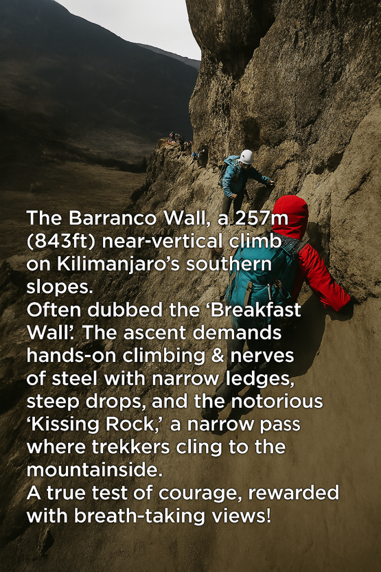 The route traverses around Kilimanjaro’s’ southern side, providing a varied trek with changing scenery & views. Kilimanjaro’s Lemosho Route itinerary includes the Barranco Wall