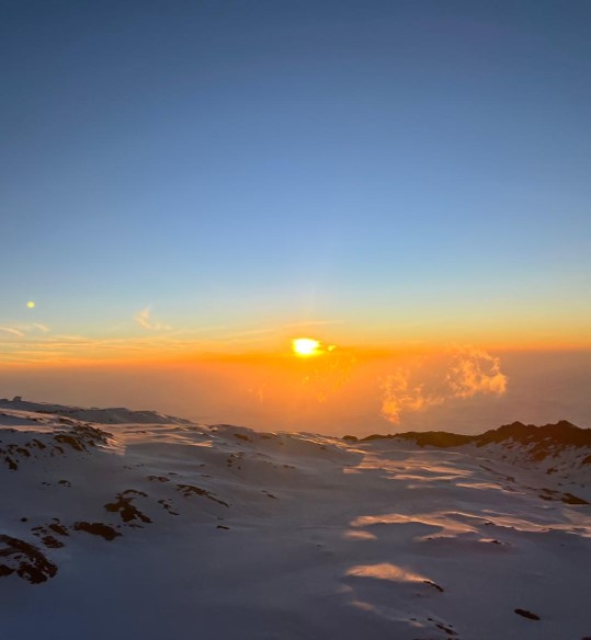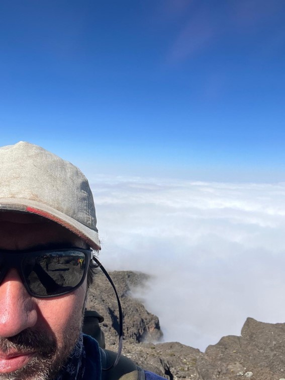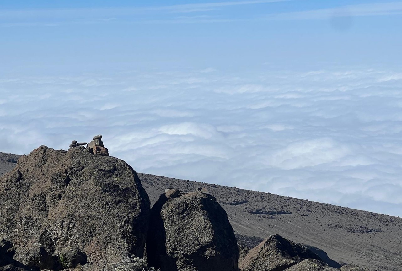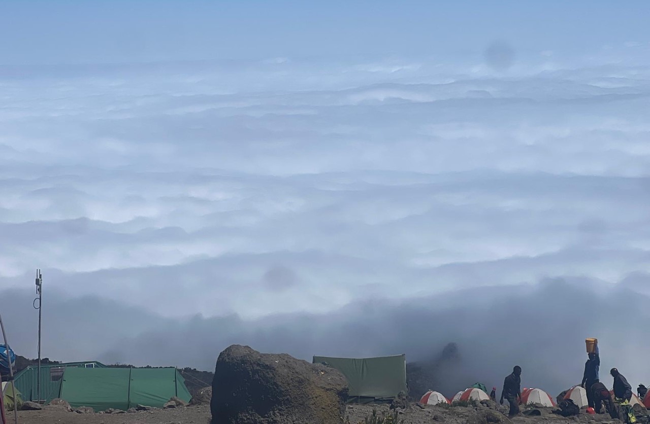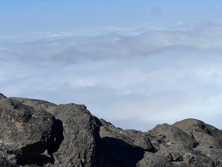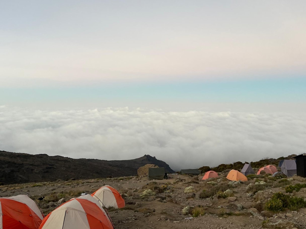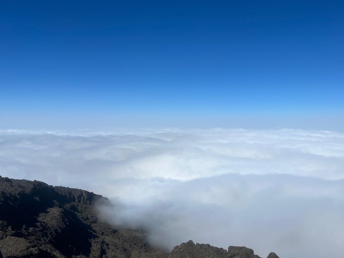 At sunrise where our camp overlooks a sea of clouds. A moment of calm after a 4-hour morning hike, before the midnight summit